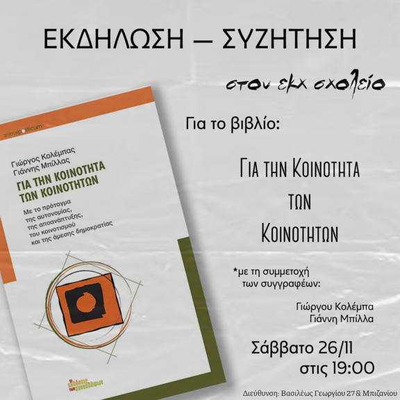 Εκδήλωση / παρουσίαση του βιβλίου "Για την Κοινότητα των Κοινοτήτων" (Εκδόσεις των Συναδέλφων, 2019) των Γιώργου Κολέμπα και Γιάννη Μπίλλα με συμμετοχή των συγγραφέων.