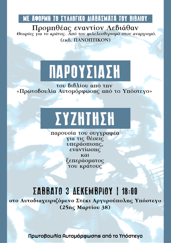 Με αφορμή το συλλογικό διάβασμα του βιβλίου «Προμηθέας εναντίον Λεβιάθαν: Θεωρίες για το κράτος - Από τον φιλελευθερισμό στον αναρχισμό» των εκδόσεων ΠΑΝΟΠΤΙΚΟΝ καλούμε σε εκδήλωση με: