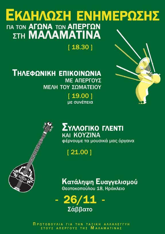 18:30 - Εκδήλωση ενημέρωσης για τον αγώνα απεργών στην Μαλαματίνα