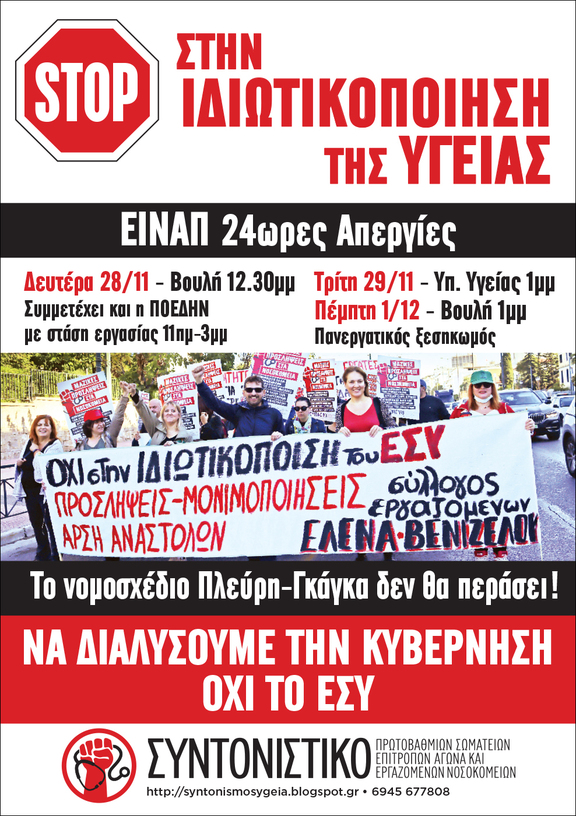 - Τρίτη 29/11: 24ωρη παναττική απεργία και συγκέντρωση στο Υπουργείο Υγείας.