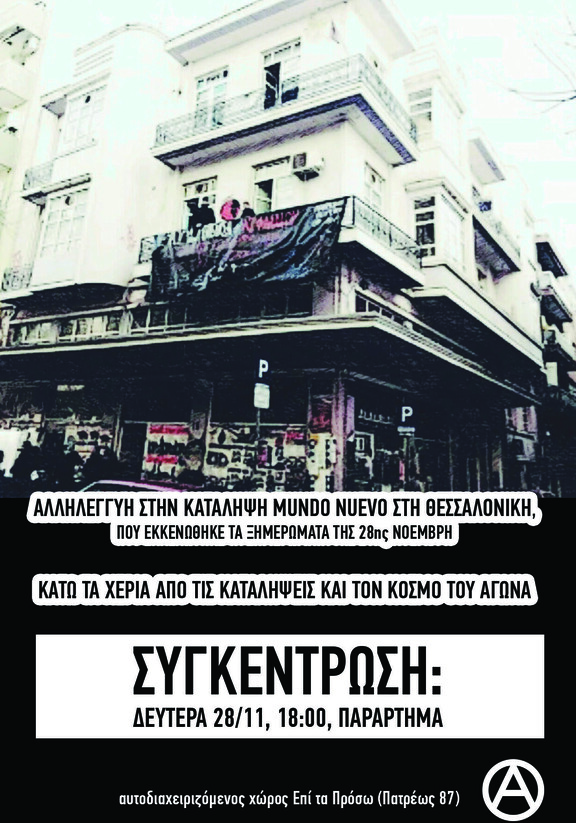 Τα ξημερώματα της Δευτέρας 28/11 αστυνομικές δυνάμεις περικυκλώνουν και εκκενώνουν την κατάληψη Mundo Nuevo στη Θεσσαλονίκη. Τέσσερις σύντροφοι-ισσες που βρίσκονται μέσα στο χώρο της κατάληψης, συλλαμβάνονται. Είναι η τρίτη κατασταλτική επίθεση του κράτους σε κατάληψη τον τελευταίο μήνα, έπειτα από την εκκένωση της Ντουγρού στη Λάρισα και των Προσφυγικών στην Αθήνα.