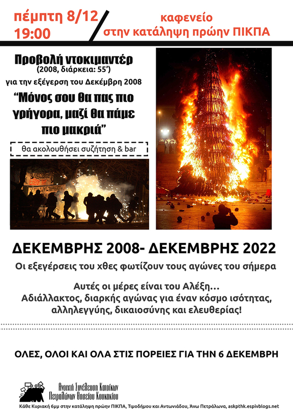 Προβολή ντοκιμαντέρ (2008, διάρκεια 55') για την εξέγερση του Δεκέμβρη του 2008 «Μόνος σου θα πας πιο γρήγορα, μαζί θα πάμε πιο μακριά».