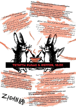 از شما دعوت میکنیم تا چهارشنبه ساعت ۶ بعدازظهر به زیزانیا بیایید تا با مواد اولیهای که از بازار خریدهایم، با هم آشپزی کنیم و غذا بخوریم. زیزانیا از حضور همهی افراد با هر پیشینهای، هر سطح درآمدی، هر زبانی، هر جنسیتی، هر تمایلات جنسیای و هر سنی استقبال میکند. به امید دیدار!