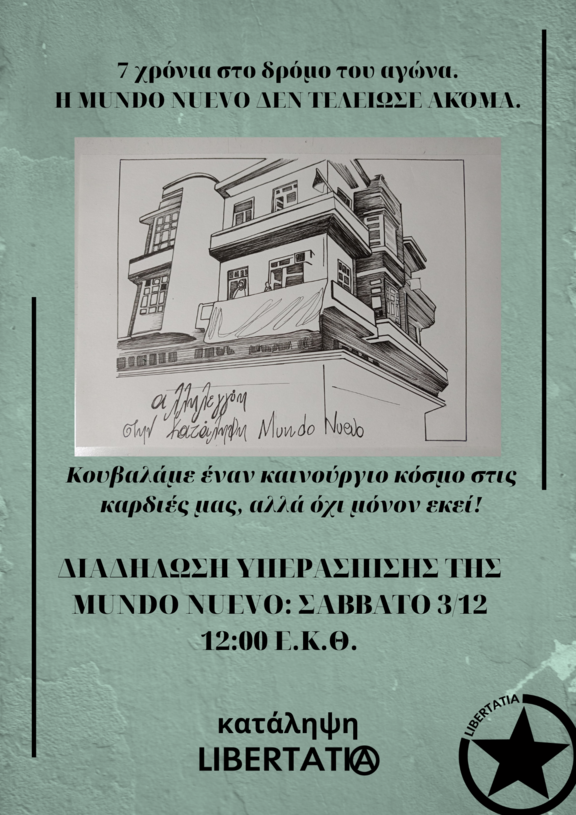 Η κατάληψη Mundo Nuevo μετράει 7 χρόνια παρουσίας στους κοινωνικούς και ταξικούς αγώνες, αποτελώντας μια από τις δομές του κινήματος, κληρονομιά και κληροδότημα της ελευθεριακής κουλτούρας, όπου γεννιέται η αντίσταση ενάντια στον κόσμο της εξουσίας και οι πολιτισμικές αντι-προτάσεις απέναντι στην εξατομίκευση, την ιδιώτευση και τον τεμαχισμό.