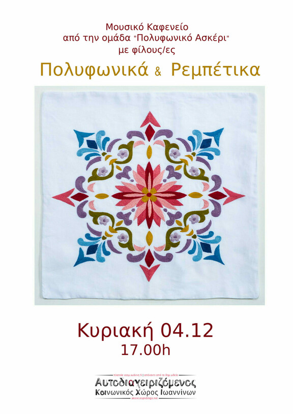 Η πολυφωνική ομάδα που στεγάζεται στον Α.Κοι.Χ.Ι "Πολυφωνικό Ασκέρι" οργανώνει καφενείο την Κυριακή 04/12, μετά τις 17.00. Πέρα από τα πολυφωνικά τραγούδια, φίλοι/ες θα συνεχίσουν με παραδοσιακά και ρεμπέτικα. Όπως κάθε Κυριακή στο στέκι, θα έχει και φαγακι.