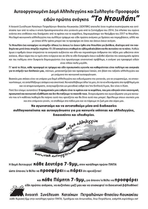 Η Ανοιχτή Συνέλευση Κατοίκων Πετραλώνων-Θησείου-Κουκακίου (ΑΣΚΠΘΚ) αποτελεί έναν πυρήνα συσπείρωσης και αντίστασης των από τα κάτω η οποία δραστηριοποιείται στις γειτονιές μας από το Σεπτέμβριο του 2014. Στο πλαίσιο του αγώνα ενάντια στις επιθέσεις που δεχόμαστε από το κράτος και το κεφάλαιο, δημιουργήσαμε τον Νοέμβριο του 2017 το Ντουλάπι. Μια δομή κοινωνικής αλληλεγγύης που συλλέγει τρόφιμα και είδη πρώτης ανάγκης με δράσεις και παρεμβάσεις, αλλά και με όποιο άλλο τρόπο μπορεί και τα προσφέρει σε όσες και όσους έχουν ανάγκη.