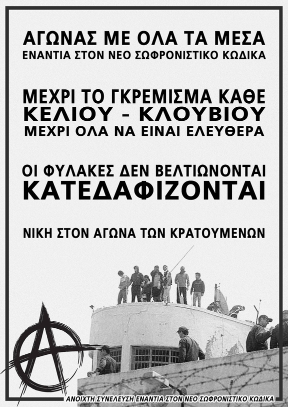 Βλέπουμε ταυτόχρονα μία προσπάθεια απόλυτου ξεπλύματος του νέου κώδικα, με άρθρα να τον παρουσιάζουν ως μία προσπάθεια κατοχύρωσης δικαιωμάτων για τα κρατούμενα. Δεν γελιόμαστε. Αναγνωρίζουμε το επικοινωνιακό θέατρο που στήνεται άλλη μια φορά. Η δημιουργία δομών που θα έπρεπε να θεωρούνται δεδομένες (ψυχιατρικό τμήμα γυναικών και νοσοκομείο στη Θήβα, οδοντιατρικό τμήμα στον Κορυδαλλό)και η κατοχύρωση "προοδευτικής" νομοθεσίας που απαγορεύει τη "δυσμενή διακριτική μεταχείριση των κρατουμένων" εξυπηρετούν το ρόλο τους στο να χτίσουν ένα φιλικό φιλελεύθερο προσωπείο για το κράτος, καλύπτοντας την καταπιεστική βιαιότητα της εξουσίας και τις πραγματικές επιπτώσεις του νέου κώδικα. Ξέρουμε ποιοι νόμοι συμφέρει να εφαρμόζονται και ποιοι να αγνοούνται. Χωρίς να αμφισβητούμε ότι οι αλλαγές αυτές μπορεί να βοηθήσουν περιστασιακά και ατομικά, ξεκαθαρίζουμε ότι το ίδιο μέσο που μας φυλακίζει, μας καταπιέζει και μας δολοφονεί, ούτε μπορεί, ούτε σκοπεύει να μας βοηθήσει. Η κυβέρνηση σπεύδει να καλύψει την όξυνση της καταπίεσης, της εξουσίας και της επιβολής πάνω σε κάθε τμήμα της ζωής των κρατουμένων.