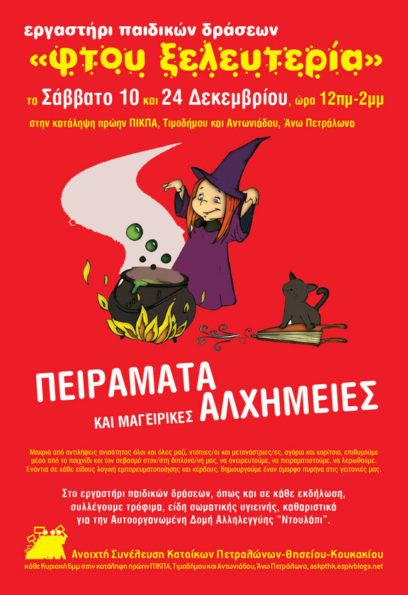 Εργαστήρι παιδικών δράσεων «Φτου Ξελευτερία» το Σάββατο 10 και 24 Δεκεμβρίου, ώρα 12πμ-2μμ, στην κατάληψη πρώην ΠΙΚΠΑ, Τιμοδήμου και Αντωνιάδου, Άνω Πετράλωνα