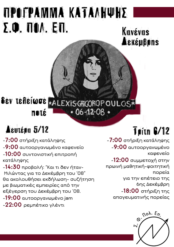 Η εξέγερση του Δεκέμβρη του '08 παραμένει και θα παραμένει ζωντανή στη συλλογική μνήμη της κοινωνίας και θα εκφράζεται μέσα από τους αγώνες της, όσο κι αν ο κρατικός μηχανισμός επιχειρεί να διαστρεβλώσει για ακόμη μια φορά την πραγματικότητα, να αποσιωπήσει την κρατική δολοφονία και την εξέγερση, τις συγκρούσεις και συνολικά την ίδια την κρατική και καπιταλιστική βαρβαρότητα που βιώνουμε σε κάθε πτυχή της ζωής μας. Το δόγμα της «προληπτικής αντι-εξέγερσης» στοχεύει στην τρομοκρατία, την καθυπόταξη και εν τέλει την καταστολή των μαθητών, των νέων, της εργατικής τάξης και των καταπιεσμένων που δεν έχουν αποδεχτεί την «κανονικότητα» της εξαθλίωσης, της ανεργίας, της μισθωτής σκλαβιάς και των πολέμων. Στοχεύει στην επικράτηση του φόβου με την ένταση της καταστολής, τις παραδικαστικές μεθοδεύσεις και σκευωρίες, τους ξυλοδαρμούς διαδηλωτών, τις συλλήψεις και τους σχεδιασμούς για εκκενώσεις καταλήψεων. Η εξέγερση μένει ζωντανή μέσα από τους αγώνες μας ενάντια στην καπιταλιστική κρίση και βαρβαρότητα, την αστυνομοκρατία, την διάλυση της δημόσιας και δωρεάν παιδείας και τον ταξικό αποκλεισμό. Ο Δεκέμβρης του ΄08 αποτελεί πηγή άντλησης κουράγιου, επιμονής και πείσματος για νέους αγωνιστές και νέες αγωνίστριες, που μάχονται καθημερινά και ασταμάτητα όχι να τον επαναλάβουν, αλλά πάνω στις παρακαταθήκες της εξέγερσης αυτής να καταφέρουν να ξεπεράσουν τις αντικειμενικές δυσκολίες της συγκυρίας και να διεκδικήσουν την ζωή που μας αξίζει. Ο αγώνας για την κοινωνική επανάσταση, είναι ένας δρόμος μακρινός και δύσβατος, κατά τον οποίο αναγκαία εφόδια είναι η υπομονή, η επιμονή, η αφοσίωση και πίστη στο οργανωμένο αναρχικό σχέδιο και σκοπό. Ο δρόμος αυτός παρόλα αυτά δεν αποτελείται μονάχα από δυσκολίες. Πέρα από τον τερματισμό και την επίτευξη της κοινωνικής επανάστασης, το ίδιο το ταξίδι του διαρκή αγώνα για βελτίωση της κάθε πτυχής της καθημερινής μας ζωής, είναι ένα ταξίδι και μια διαδικασία που μας υπενθυμίζει το γεγονός ότι ο άνθρωπος είναι ένα κοινωνικό και άρα συλλογικό όν. Είναι ένας αγώνας για ζωή που ξεκινά από τις απλές και καθημερινές μάχες, ακόμη και με τον ίδιο μας τον εαυτό κόντρα στην καπιταλιστική σάπια ιδεολογία που μας εμποτίζει από την ώρα που γεννιόμαστε με τάσεις απομόνωσης, άγχους και κατάθλιψης, ανταγωνισμού και κοινωνικού κανιβαλισμού κλπ. Ας μην σπαταλάμε άλλο χρόνο λοιπόν! Για πόσο ακόμα θα εθελοτυφλούμε δικαιολογώντας την απαθή μας στάση; Είναι ώρα να πάρουμε την ζωή μας στα χέρια μας και μέσα από τα εγχειρήματα του αναρχικού αγώνα, να γκρεμίσουμε και να καταστρέψουμε από τα θεμέλιά του το κρατικο - καπιταλιστικό σύστημα εξουσίας και πάνω στο νέο έδαφος να χτίσουμε και να ριζώσουμε γερές βάσεις για έναν κόσμο πραγματικά ανιδιοτελή, για μια κοινωνία ισότητας και ελευθερίας, για την Αναρχία και τον Κομμουνισμό.