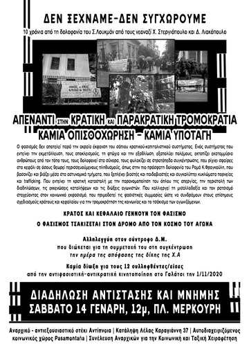ΚΑΛΟΥΜΕ, ΣΤΗΡΙΖΟΥΜΕ ΤΗΝ ΠΟΡΕΙΑ ΤΙΜΗΣ ΚΑΙ ΜΝΗΜΗΣ ΓΙΑ ΤΑ 10 ΧΡΟΝΙΑ ΑΠΟ ΤΗΝ ΔΟΛΟΦΟΝΙΑ ΤΟΥ ΣΑΧΤΖΑΤ ΛΟΥΚΜΑΝ ΤΟ ΣΑΒΒΑΤΟ 14/1 ΣΤΗΝ ΠΛΑΤΕΙΑ ΜΕΡΚΟΥΡΗ ΣΤΙΣ 12:00 π.μ.