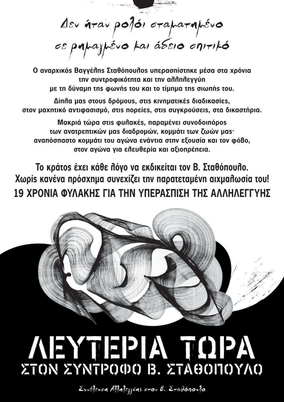 ΛΕΥΤΕΡΙΑ ΣΤΟΝ ΑΝΑΡΧΙΚΟ Β. ΣΤΑΘΟΠΟΥΛΟ που καταδικάστηκε σε 19 χρόνια κάθειρξης για την υπεράσπιση τηςαλληλεγγύης,σε μια δίκη χωρίς στοιχεία