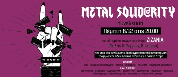 επόμενη ανοιχτή συνέλευση Metal Solid@rity αυτήν την Πέμπτη 8/12 στις 20:00 στο κατειλημμένο κοινωνικό κέντρο ΖΙΖΑΝΙΑ (Φυλής και Φερρών, Βικτώρια).