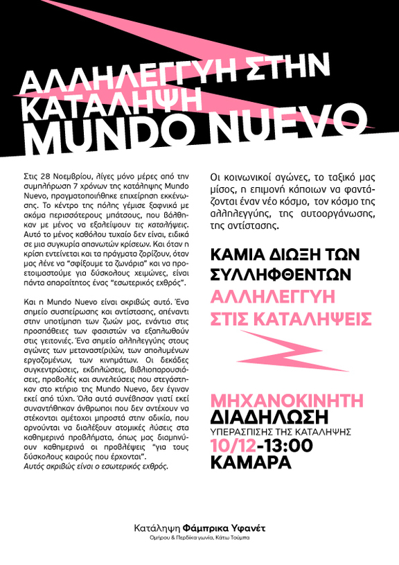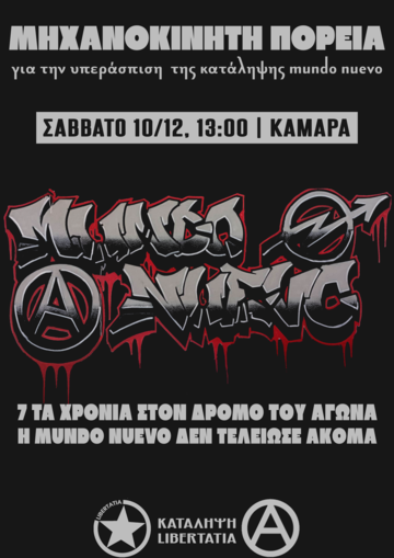 [...]Ναι, ασφαλώς είχαμε και έχουμε πάντα έναν καινούργιο κόσμο στις καρδιές μας, αλλά δεν βρίσκεται μονάχα εκεί. Αλλά σε όσα έχουμε φτιάξει ήδη, σε όσα έχουν ήδη δημιουργηθεί και πάρει τον δρόμο τους μέσα στο απέραντο ποτάμι της ορμητικής ελευθερίας που ονομάζουμε Αναρχία. Νέοι και παλιοί σύντροφοι και συντρόφισσες συνεχίζουν αδιάκοπα την πάλη και αυτό θα συνεχίσουμε να κάνουμε κι εμείς ασφαλώς. Πρώτα και κύρια διεκδικώντας πίσω τη Mundo Nuevo. Ο αγώνας για την ανάκτηση μόλις έχει αρχίσει και καλούμε όλο το κίνημα πανελλαδικά αλλά και στο εξωτερικό να στηρίξει αυτήν την υπόθεση, γιατί δεν αφορά μόνο εμάς αλλά ολόκληρο το ριζοσπαστικό, αναρχικό και καταληψιακό κίνημα.