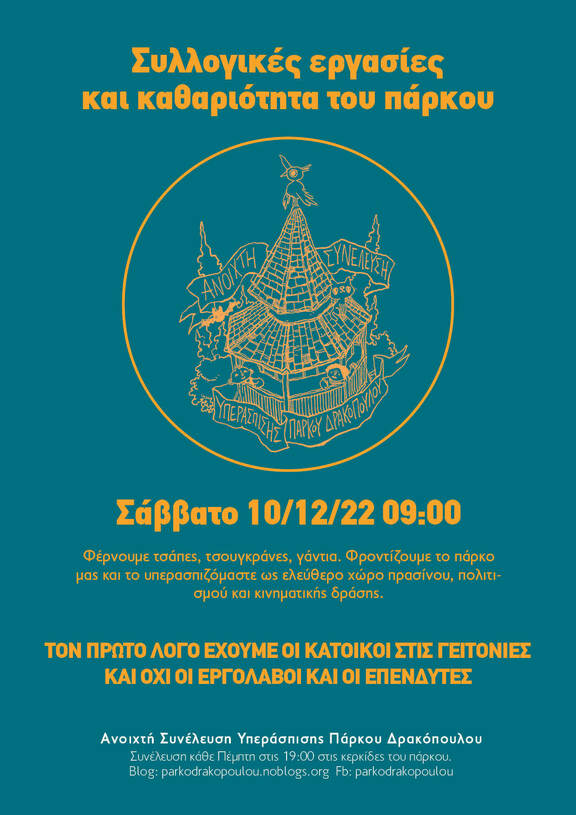 Φέρνουμε τσάπες, τσουγκράνες, γάντια. Καθαρίζουμε το πάρκο, επισκευάζουμε φθορές και ποτίζουμε τα δεντράκια που φυτέψαμε. Φροντίζουμε το πάρκο μας και το υπερασπιζόμαστε σαν ελέυθερο χώρο πρασίνου, πολιτισμού και κινηματικής δράσης