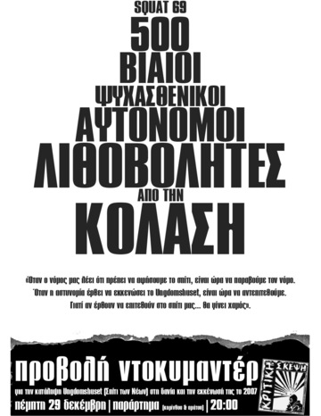 προβολή του ντοκυμαντέρ «Squat 69: 500 βίαιοι ψυχασθενικοί αυτόνομοι λιθοβολητές από την κόλαση» την