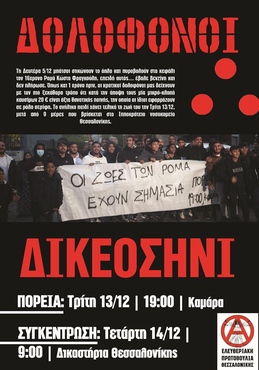 Συμμετέχουμε στην σημερινή διαδήλωση 13/12 στην Καμάρα στις 19:00. Καλούμε τον κόσμο αύριο έξω απο το δικαστικό μέγαρο Θεσσαλονίκης, οπού κρίνεται αν θα προφυλακιστεί ή όχι ο μπάτσος-δολοφόνος.