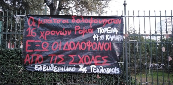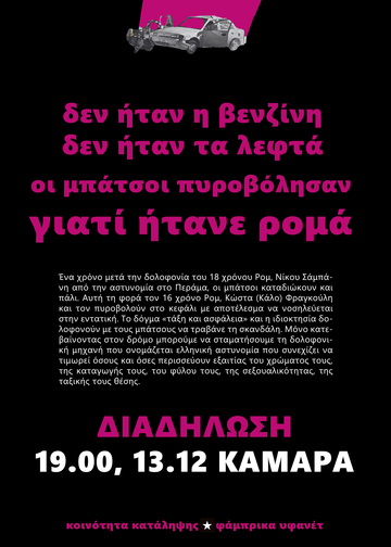 Τα ξημερώματα της 5ης Δεκεμβρίου, στη Θεσσαλονίκη οι μπάτσοι καταδιώκουν αυτοκίνητο αφοτου ο 16χρονος Ρομά που το οδηγούσε έφυγε από το βενζινάδικο χωρίς να πληρώσει τα 20 ευρώ των καυσίμων. Η καταδίωξη από το περιπολικό και την ομάδα ΔΙ.ΑΣ. σταματάει όταν η σφαίρα ενός βρίσκει το κεφάλι του ανήλικου. Για πολλές μέρες το παιδί βρισκόταν σε κρίσιμη κατάσταση στα επείγοντα του Ιπποκράτειου νοσοκομείου, ενώ ο διευθυντής της δομής δεν είχε κάνει την παραμικρή ενημέρωση για την κατάσταση της υγείας του - αν ζει ή αν πέθανε! - προφανώς σύμφωνα με τις εντολές κυβέρνησης και ΓΑΔΘ. Μόλις πριν λίγες ώρες ανακοινώθηκε και επίσημα ο θάνατός του, επισφραγίστηκε η δολοφονία του από τα ένστολα καθάρματα του κράτους και του κεφαλαίου.