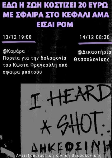 Τα ξημερώματα της Δευτέρας 5/12, στη δυτική Θεσσαλονίκη, μπάτσοι της ομάδας ΔΙΑΣ αποπειραθηκαν να δολοφονησουν τον 16χρονο Ρομα Κώστα Φραγκουλη. Κατά τη διάρκεια καταδίωξης ένας από τους μπάτσους σημάδεψε και πυροβόλησε στο κεφάλι τον Κώστα με αποτέλεσμα, μετά από μία εβδομάδα σε κώμα, να ανακοινώνεται ο θάνατος του την Τρίτη 13 Δεκεμβρίου.