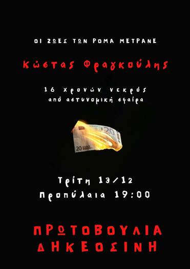 Ο 16χρονος Κώστας Φραγκούλης είναι νεκρός. Στις 5 Δεκέμβρη η ελληνική αστυνομία αποφάσισε την θανατική του καταδίκη. Η εγκληματοποίηση της κοινότητας των Ρομά και η ποινικοποίηση της φτώχειας ενεργοποίησαν τα δολοφονικά ένστικτα της Ελληνικής αστυνομίας. Δημοσιογράφοι, μεγαλοδικηγόροι, δικαστικοί υπάλληλοι, ευυπόληπτοι πολίτες χτίζουν οχυρό υπεράσπισης στον αστυνομικό που πυροβόλησε και δολοφονούν ξανά αυτή τη φορά τον χαρακτήρα του 16χρονου Κώστα Φραγκούλη.