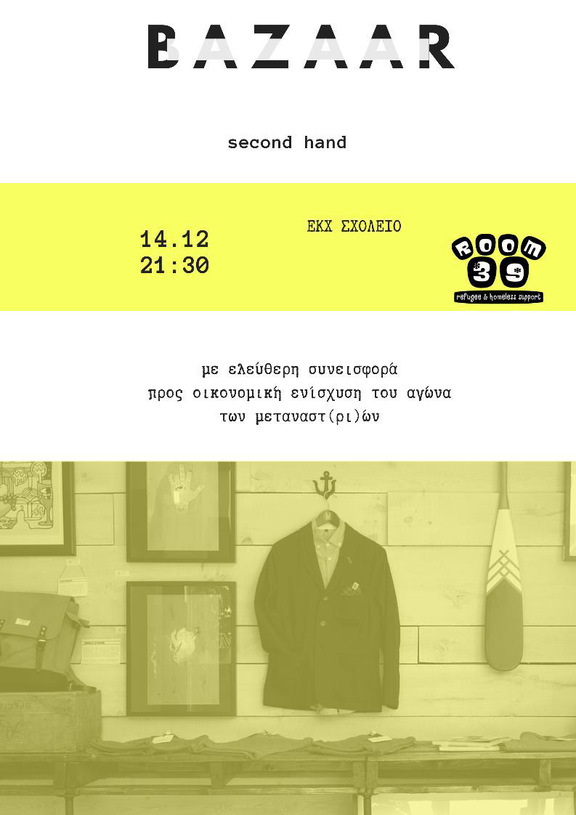 Παράλληλα στο χώρο θα υπάρχει παζάρι ρούχων και αντικειμένων με ελεύθερη συνεισφορά για την οικονομική ενίσχυση του αγώνα των μεταναστριών, από τη συλλογικότητα Room39.