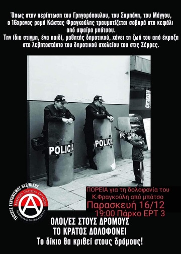 Τα ξημερώματα της 5ης Δεκεμβρίου, στη Θεσσαλονίκη οι μπάτσοι καταδιώκουν αυτοκίνητο αφοτου ο 16χρονος Ρομά που το οδηγούσε έφυγε από το βενζινάδικο χωρίς να πληρώσει τα 20 ευρώ των καυσίμων. Η καταδίωξη από το περιπολικό και την ομάδα ΔΙ.ΑΣ. σταματάει όταν η σφαίρα ενός βρίσκει το κεφάλι του ανήλικου. Για πολλές μέρες το παιδί βρισκόταν σε κρίσιμη κατάσταση στα επείγοντα του Ιπποκράτειου νοσοκομείου, ενώ ο διευθυντής της δομής δεν είχε κάνει την παραμικρή ενημέρωση για την κατάσταση της υγείας του - αν ζει ή αν πέθανε! - προφανώς σύμφωνα με τις εντολές κυβέρνησης και ΓΑΔΘ. Μόλις πριν λίγες μέρες ανακοινώθηκε και επίσημα ο θάνατός του, επισφραγίστηκε η δολοφονία του από τα ένστολα καθάρματα του κράτους και του κεφαλαίου. Την ίδια μέρα με την ανακοίνωση της δολοφονίας, οι μπάτσοι επιβραβεύτηκαν με το επίδομα των 600€ .