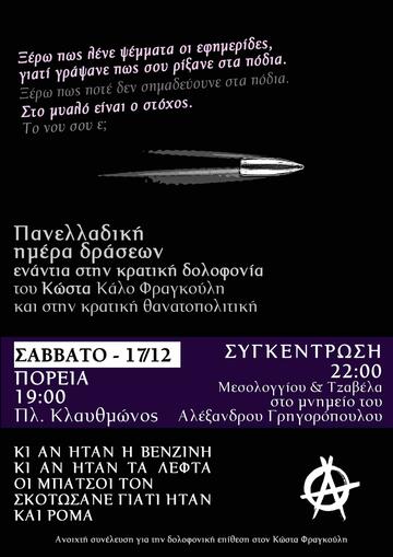 Η κρατική δολοφονία του 16χρονου Κώστα Φραγκούλη, ο οποίος στις 5 Δεκεμβρίου πυροβολήθηκε από ένστολα καθάρματα της ομάδας ΔΙΑΣ επειδή δεν πλήρωσε 20ευρω βενζίνη και επειδή ήταν ρομά, μας γεμίζει θλίψη και απέραντη οργή για το κράτος-δολοφόνο και τους αμέτρητους νεκρούς που έχει αφήσει πίσω του μέσα από καταδιώξεις, βασανισμούς και σφαίρες εν ψυχρώ. Μας γεμίζει οργή για τους έμμισθους φονιάδες της αστυνομίας και το σάπιο οικονομικό και πολιτικό σύστημα που υπηρετούν, το οποίο αποφάσισε να αμαυρώσει την μνήμη ενός 16 χρόνου παιδιού επιβραβεύοντας τους δολοφόνους του με επίδομα 600 ευρώ ανήμερα της ανακοίνωσης του θανάτου του.