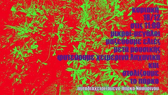 Την Κυριακή 18/12 στις 11 το πρωί, μικροί και μεγάλοι ενώνουμε τις δυνάμεις μας και μαζεύουμε, για μια ακόμα χρονιά, τις ελιές του πάρκου ενώ παράλληλα φυτεύουμε το χειμωνιάτικο περιβόλι μας και στολίζουμε!