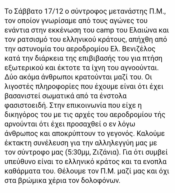 [Αθήνα] Έκτακτη συνέλευση για την απαγωγή και το βασανισμό μετανάστη συντρόφου