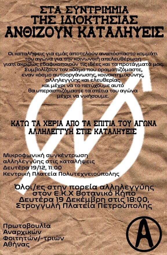 Καλούμε σε μικροφωνική συγκέντρωση αλλυλεγγύης στις καταλήψεις την Δευτέρα 19/12,στις 11:00,στην Kεντρική Πλατεία Πολυτεχνειούπολης και σε πορεία αλληλεγγύης στον Ε.Κ.Χ Βοτανικό Κήπο, στις 18:00,στην Στρογγυλή Πλατεία Πετρούπολης