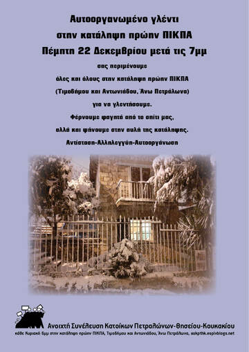 Την Πέμπτη 22 Δεκεμβρίου μετά τις 7μμ σας περιμένουμε όλες και όλους στην κατάληψη πρώην ΠΙΚΠΑ (Τιμοδήμου και Αντωνιάδου, Άνω Πετράλωνα) για να γλεντήσουμε.