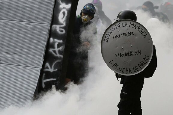 μαυροντυμένο άτομο ανάμεσα σε καπνούς κρατάει μια χειροποίητη ασπίδα που γράφει*μέσα από την μάσκα υπάρχει μια ιδέα - και οι ιδέες είναι αλεξίσφαιρες*