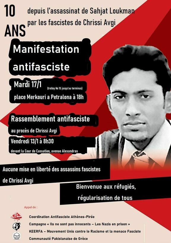 Cela fait 10 ans que le travailleur immigré Sahjat Loukman a été assassiné a Pétralona par sept coups de couteau par deux fascistes de Chrissi Avgi alors qu'il allait en vélo a son travail. Huit mois plus tard les fascistes ont assassiné Pavlos Fyssas à Keratsini. C'est l'explosion de colère des antifascistes qui a mis fin à l'immunité pour Chrissi Avgi.