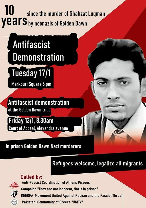 On January 17, 2013, it will be ten years since the brutal murder of the migrant worker Shahzat Luqman in Petralona, with seven stab wounds by nazis of Golden Dawn Liakopoulos and Stergiopoulos. The fascists chased him with a motorcycle while he was commuting to work by bicycle from his home in Peristeri to the laiki market in Petralona. Eight months later, the nazis of Golden Dawn murdered Pavlos Fyssa in Keratsini. The anti-fascist outburst of anger put an end to Golden Dawn's immunity.