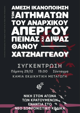 Καλούμε σε συγκέντρωση αλληλεγγύης στον αναρχικό, αιχμάλωτο μέλος της Οργάνωσης Αναρχικής Δράσης, Θάνο Χατζηαγγέλου, που διανύει την 10η ημέρα απεργίας πείνας και δίψας, την Πέμπτη 29 Δεκεμβρίου, 19:00, στην πλ. Συντάγματος.