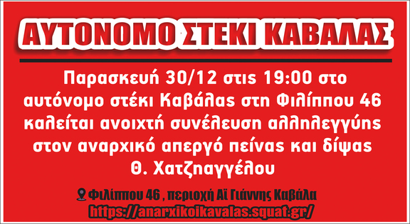 Παρασκευή 30/12 στις 19:00 στο αυτόνομο στέκι Καβάλας στη Φιλίππου 46 καλείται ανοιχτή συνέλευση αλληλεγγύης στον αναρχικό απεργό πείνας και δίψας Θ. Χατζηαγγέλου