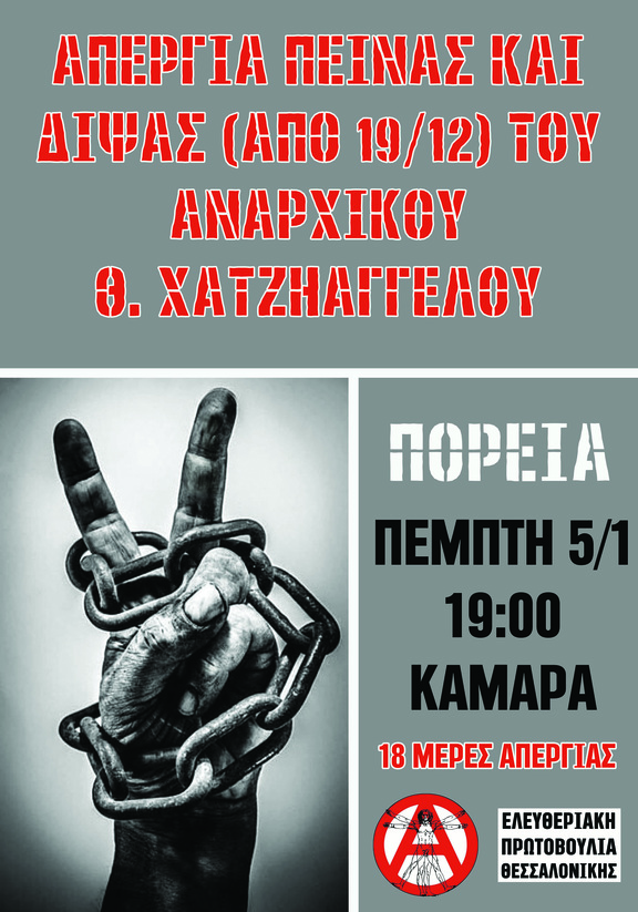Απο τις 22/12 σε απεργία πείνας βρίσκεται και ο αναρχικός Γ. Μιχαήλιδης ως ένδειξη άμεσης αλληλεγγύης στην απεργία πείνας και δίψας του Θ. Χατζηαγγέλου και για όσο αυτός βρίσκεται στην κρίσιμη και εξαιρετικά επικίνδυνη για τη ζωή του, φάση της απεργίας δίψας.