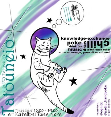 Θέλεις να σχεδιάσεις, ανταλλάξεις γνώσεις ή να κάνεις τατουάζ στον εαυτό σου; Έλα στο τατουνειο* κάθε Τρίτη του Ιανυάριου μεταξύ 16:00 και 19:00 στη Rosa Nera.