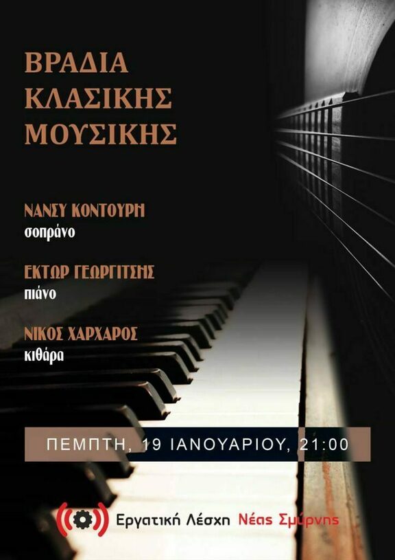Την ΠΕΜΠΤΗ 19/01/2023 στις 9.00μμ στην Εργατική Λέσχη Νέας Σμύρνης θα δοθεί συναυλία κλασικής μουσικής.