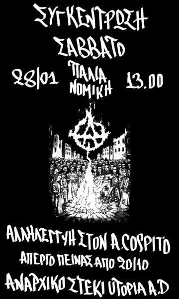Κάλεσμα σε συγκέντρωση αλληλεγγύης με τον αναρχομηδενιστή απεργό πείνας από 20/10/2022 Alfredo Cospito. Σάββατο 28/01 και ώρα 13:00 στον πεζόδρομο παλιάς νομικής.