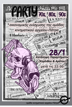 Πάρτυ οικονομικής ενίσχυσης της ομάδας κινηματικού αρχείου- Πάτρα στην Κατάληψη Παραρτήματος. Σας περιμένουμε το Σάββατο 28/1 μετά τις 22:00.