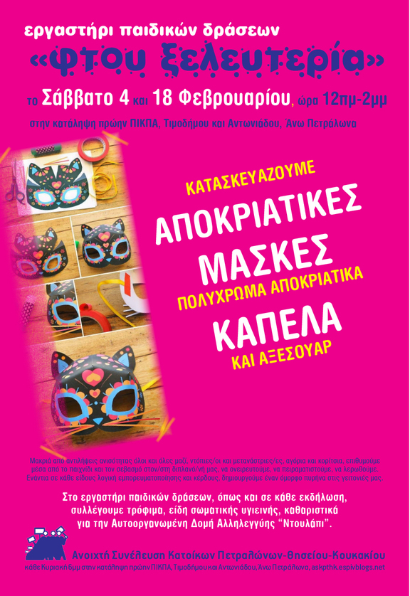 Το Σάββατο 4 και 18 Φεβρουαρίου 2023, στις 12πμ-2μμ, στο εργαστήρι παιδικών δράσεων «Φτου Ξελευτερία» κατασκευάζουμε αποκριάτικες μάσκες, πολύχρωμα αποκριάτικα καπέλα και αξεσουάρ!