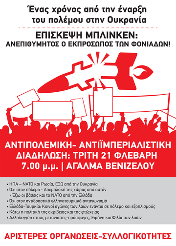 Η άφιξη του ΥΠΕΞ των ΗΠΑ Μπλίνκεν στην Ελλάδα, αλλά και ο ένας χρόνος από την επίσημη έναρξη του πολέμου στην Ουκρανία δεν μπορεί παρά να αποτελέσει αφορμή για έναν νέο κύκλο αντιπολεμικών και αντιιμπεριαλιστικών αγώνων, έναν νέο κύκλο αντίστασης στις πολεμικές ορέξεις και στην οικονομική εξαθλίωση που μας προσφέρει η ελληνική αστική τάξη, η ΕΕ και το ΝΑΤΟ, οι ίδιοι που μας προετοιμάζουν για να γίνουμε κρέας για τα κανόνια τους, για τα συμφέροντά τους.