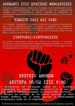 3 χρόνια αφότου ξεκίνησε η δίωξη των 3 συντρόφων και της συντρόφισσας για την υπόθεση "σύντροφοι/συντρόφισσες", στις 6/02 ξεκινάει η δίκη. Από τις σημαντικότερες υποθέσεις που η αντιτρομοκρατική υπηρεσία προσπαθεί να κατασκευάσει, με πρωτόγνωρες άτυπες ποινές πριν την δίκη που παρουσιάζονται με το πρόσωπο των περιοριστικών όρων. Τα 4 συντρόφια , παραπέμπονται στη δίκη χωρίς να έχουν καταφέρει να κάνουν άρση όλων των περιοριστικών όρων που τους επιβλήθηκαν από τον Μάρτιο του 2020. Πιο συγκεκριμένα, ο αναρχικός Γ.Ι. βρίσκεται μέχρι και σήμερα σε ένα άτυπο καθεστώς ομηρίας με 9 περιοριστικούς όρους: