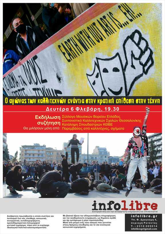 Εκδήλωση-συζήτηση στο χώρο του infolibre, τη Δευτέρα 6 Φλεβάρη στις 19.30 με θέμα "Ο αγώνας των καλλιτεχνών ενάντια στην κρατική επίθεση στην τέχνη". Θα μιλήσουν μέλη από: Σύλλογο Μουσικών Βορείου Ελλάδος, Συντονιστικό Καλλιτεχνικών Σχολών Θεσσαλονίκης, Κατάληψη Σπουδαστριών ΚΘΒΕ. Παρεμβάσεις από καλλιτέχνες και σχήματα.