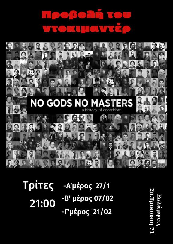 Προβολή του ντοκιμαντέρ ""No Gods No Masters" για την ιστορία του αναρχισμού, σε τρία μέρη διάρκειας περίπου 50' το καθένα.