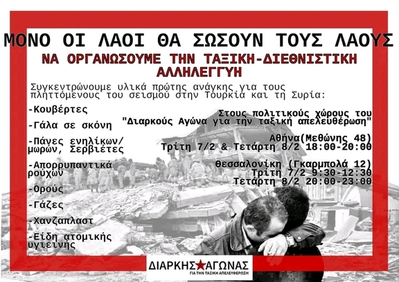 ΣΥΓΚΕΝΤΡΩΝΟΥΜΕ ΥΛΙΚΑ ΠΡΩΤΗΣ ΑΝΑΓΚΗΣ ΓΙΑ ΤΟΥΣ ΠΛΗΤΤΟΜΕΝΟΥΣ ΤΟΥ ΣΕΙΣΜΟΥ ΣΤΗΝ ΤΟΥΡΚΙΑ ΚΑΙ ΤΗ ΣΥΡΙΑ ΣΤΟΥΣ ΠΟΛΙΤΙΚΟΥΣ ΧΩΡΟΥΣ ΤΟΥ ΔΙΑΡΚΟΥΣ ΑΓΩΝΑ ΓΙΑ ΤΗΝ ΤΑΞΙΚΗ ΑΠΕΛΕΥΘΕΡΩΣΗ