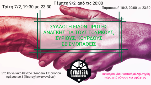 🤝Συλλογή ειδών πρώτης ανάγκης για τους Τούρκους, Σύριους, Κούρδους σεισμοπαθείς στο Κοινωνικό Κέντρο Ovradera, τις παρακάτω μέρες/ώρες:
