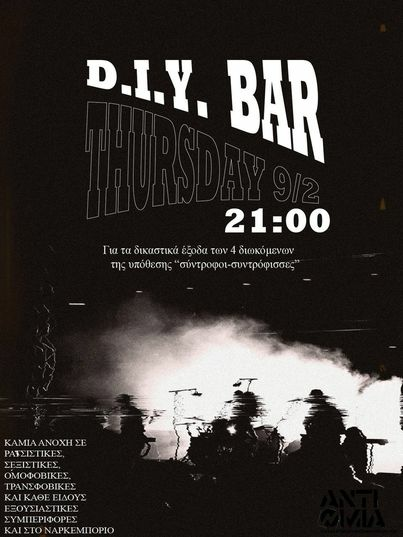 21:00 D.I.Y Bar για τα δικαστικά έξοδα των 4 διωκόμενων συντρόφων/ισσας της υπόθεσης "Σύντροφοι-Συντρόφισσες"