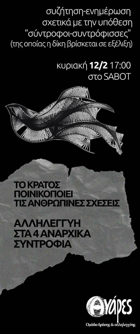 Συζήτηση ενημέρωση σχετικά με την υπόθεση σύντροφοι/συντρόφισσες και τη τρέχουσα δίκη. Με τη συμμετοχή συντροφιών από την ανοιχτή συνέλευση που τρέχει για το ζήτημα στην Αθήνα. Δε θα αφήσουμε κανένα συντρόφι μόνο στις ορέξεις του κράτους, της (αντι)τρομοκρατικής και τις κατασταλτικές τους ψυχεδέλειες.