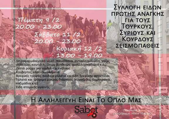 Συλλογή ειδών πρώτης ανάγκης για τους Τούρκους, Σύριους και Κούρδους σεισμοπαθείς.